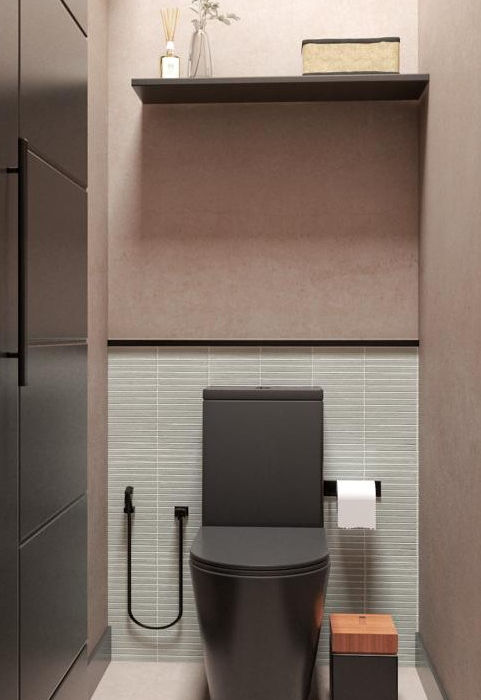 Banheiro fechamento em placa cimentícia e revestimento vinílico.